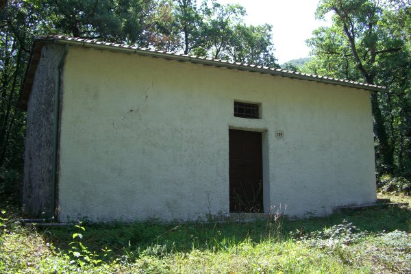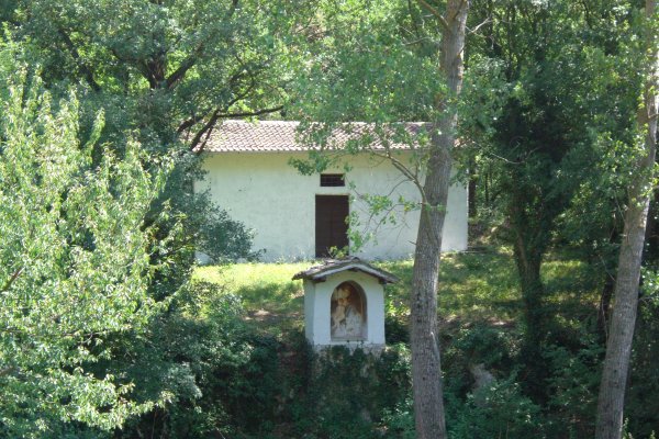 Poco lontano dal confine di Scopoli con Leggiana, lungo il fiume Menotre, si erge, ben visibile, un’edicola in posizione sopraelevata rispetto alla strada (ss. 77 Val di Chienti).
